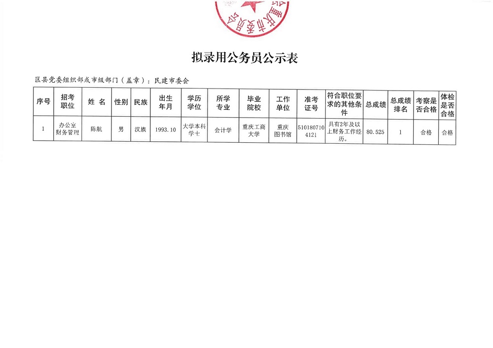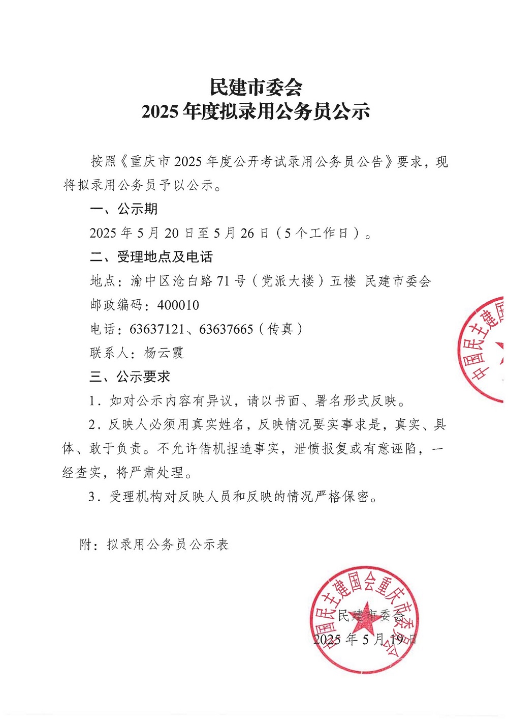 中国民主建国会重庆市委员会-民建市委会2025年度拟录用公务员公示